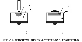 В точечном диоде используется пластинка германия или кремния с электропроводностью n-типа (рис. 2.1, а). С пластинкой соприкасается игла с нанесенной на нее акцепторной примесью, которая диффундирует в основной полупроводник, создавая область с другим типом электропроводности. Таким образом, вокруг иглы образуется р-n переход полусферической формы очень малой площади. За счет этого точечные диоды могут работать на высоких частотах, однако, при небольших токах (порядка десятков миллиампер).
