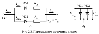 Параллельное согласное соединение диодов (рис. 2.3, а) применяют в том случае, когда нужно получить прямой ток, превышающий предельный допустимый ток одного диода. Ток цепи при параллельном включении диодов