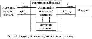 Усилителем называют устройство, предназначенное для увеличения параметров электрического сигнала (напряжения, тока, мощности). Усилитель имеет входную цепь, к которой подключается источник входного сигнала, и выходную цепь, с которой выходной сигнал снимается и подается в нагрузку (рис.6.1).