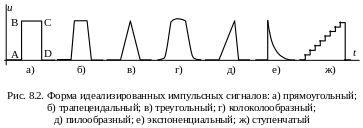 Устройства, использующие дискретные сигналы работаю в импульсном режиме, при котором чередуются рабочие моменты и паузы. Под электрическим импульсом понимают кратковременное изменение тока и (или) напряжения, которое может происходить по различным законам, что определяет форму импульсов (рис.8.2).