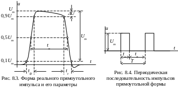 Реальный прямоугольный импульс отличается от идеализированного вследствие переходных процессов, происходящих в цепях. Параметрами импульса (рис.8.3) являются: