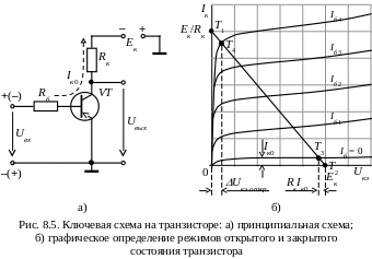 Ключевая схема на биполярном транзисторе типа р-n-р приведена на рис.8.5, а. Транзистор VT выполняет функцию ключа в последовательной с резистором Rк и источником питания Ек цепи. Для анализа ключевой схемы воспользуемся графо-аналитическим методом с использованием линии нагрузки по постоянному току (прямая Т1Т2, рис.8.5, б). Точки пересечения линии нагрузки с ВАХ транзистора определяют напряжение на элементах и ток в последовательной цепи.