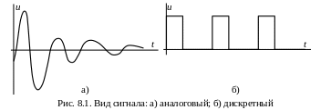 В настоящее время в радиоэлектронике используются сигналы двух видов: аналоговые и дискретные (рис. 8.1). Аналоговые сигналы имеют непрерывный характер и в заданном диапазоне уровней могут принимать любые значения напряжений и токов. Дискретные сигналы имеют прерывистый характер, как по времени, так и по уровню.