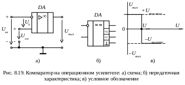Компаратором называют устройство, предназначенное для сравнения двух напряжений, поступающих на его входы (англ. compare – сравнивать). Компаратор может быть собран на отдельном операционном усилителе (рис. 8.19, а), также выпускаются в виде специализированных интегральных микросхем (рис. 8.19, б).