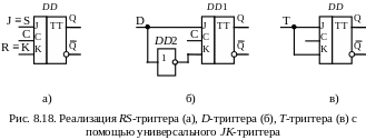 D-триггер создается введением инвертора в цепь входа K (рис. 8.18, б).