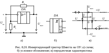 Триггер Шмитта предназначен для формирования напряжения прямоугольной формы из входного напряжения произвольной формы и является пороговым элементом. Схема триггера может выполняться на базе ОУ, а также выпускается в виде специализированной интегральной микросхемы, условное обозначение которой приведено на рис. 8.20, б.