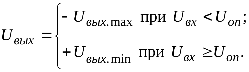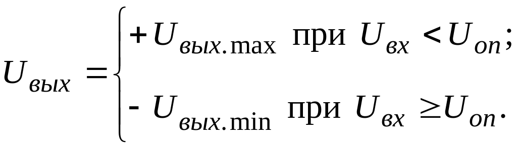 При Uвх < Uоп напряжение U0 < 0, в связи с чем выходное напряжение Uвых = +Uвых.max. При Uвх ≥ Uоп напряжение U0 > 0 происходит изменение полярности напряжения на выходе ОУ на –Uвых.min: