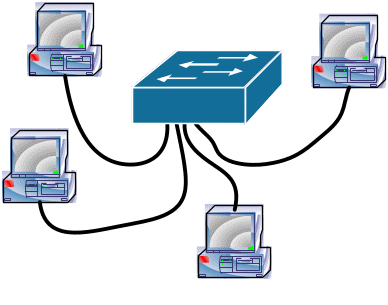 Если компьютеры подключены вдоль одного кабеля (сегмента), топология называется «шиной». В том случае, когда компьютеры подключены к сегментам кабеля, исходящим из одной точки (коммутатора), топология называется «звездой». Если кабель, к которому подключены компьютеры, замкнут в кольцо, такая топология носит название «кольцо», а если все компьютеры соединены друг с другом отдельными кабелями, топология называется ячеистой.