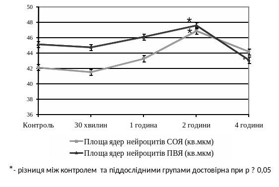 Рис. 6.5. Каріометричні криві розподілу площі перерізу ядер нейроцитів СОЯ і ПВЯ гіпоталамуса одномісячних птахів при охолодженні різної тривалості.