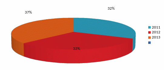 По поступлению стационарных больных в травматологическое отделение, нами были использованы данные медицинской статистики ГБУЗ РБ ЦГБ г. Сибай. Исследования статистических данных за последние три года показывают, что в последние годы частота поступления больных с травмами увеличивается. Всего в травматологическое отделение за последние три года поступило 235 пациентов. Так в 2011 году поступило 176 (32,3%) пациентов, в 2012 году 171 (32, 2 %) пациентов, в 2013 году 188 (37,4 %) пациентов.