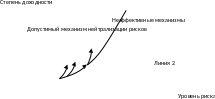 График отражает зависимость, согласно которой стремление получить повышенный доход всегда сопряжено с риском неопределенности и повышением уровня риска. Допустимым считается положение над кривой, состояние ниже равновесной кривой считается неоптимальным. В данном случае необходимо осуществить поиск механизмов, позволяющих снизить уровень риска без снижения доходности (движение вдоль линии 2 справа налево).
