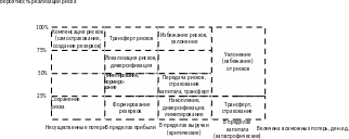 Если риск способен привести либо к существенным потерям, не превышающим прибыль, эффективными являются внутренние механизмы управления рисками (самострахование, компенсация, создание резервов, лимитирование рисков, локализация). С повышением величины возможных потерь и вероятности реализации рисков до критического и катастрофического уровня, их принятие становится неэффективным – используются внешние методы управления рисками (передача трансферт, страхование или полное отклонение от рисков). Если риск превышает определенную границу, то его передача становится экономически нецелесообразной ввиду того, что бизнес-партнеры могут не принять такой риск, а страховые и специализированные компании – значительно завысить страховые тарифы и величину страховых взносов в рассматриваемых случаях.