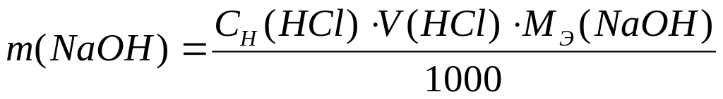 Выполнение работы. В коническую колбу, содержащую раствор ще-лочи, прибавляют 2-3 капли индикатора метилового оранжевого, титруют раствором соляной кислоты, которую наливают в бюретку, до перехода ок-раски раствора из желтой в розовую. Для титрования щелочи можно исполь-зовать индикатор фенолфталеин – в этом случае титруют кислотой до обес-цвечивания раствора. Расчет проводят по формуле :