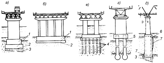 Применяемые фундаменты мостовых опор различают по глубине их заложения и по особенностям конструкции.
