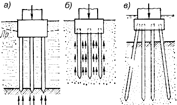 Сваи значительно хуже сопротивляются действию горизонтальных сил, чем вертикальных, поэтому при передаче фундаменту больших горизонтальных усилий часть свай нужно забивать наклонно с тем, чтобы их направление было ближе к направлению равнодействующих усилий, передаваемых фундаменту (см. рис.7, в).