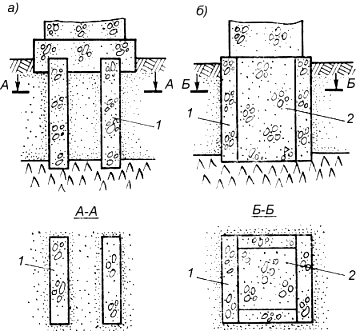 Сваи-столбы, или просто столбы, отличаются от забивных свай или оболочек способом их возведения. Столбы сооружают без принудительного заглубления, устраивая в грунте или скальном основании скважины, заполняемые затем бетонной смесью. Скважины и, следовательно, бетонируемые в них столбы могут иметь уширения в нижней части для увеличения их несущей способности. Дальнейшим развитием конструкций в виде столбов можно считать фундаменты из стенок в грунте, сооружаемых в предварительно устроенных траншеях. Такие типы фундаментов удобны при большой длине возводимого сооружения. Для устройства этих фундаментов в грунте выкапывают прямоугольные прорези, заполняемые по мере их разработки глинистым раствором (рис.8, а). Затем прорези-котлованы заполняют бетонной смесью (рис.8, б), устанавливая в случае необходимости арматурные каркасы. Стенки могут непосредственно служить фундаментами, передающими давление на нижележащие более прочные грунты (рис.9, а). Иногда их используют как ограждение для последующей разработки, окруженной ими части грунта и устройства под их защитой тела фундамента (рис.9, б). Этот вид фундаментов во многих случаях весьма экономичен и легко осуществим.