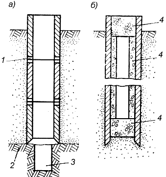 Если оболочка должна передавать давление на твердый глубинный слой грунта, то ее погружают вибрированием до поверхности этого слоя. После извлечения всего грунта из оболочки через нее пробуривают твердый грунт на глубину, достаточную для надежной передачи давления от оболочки (см. рис.17, а).