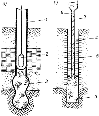 В скважины, заполненные глинистым раствором, бетонную смесь подают вниз по трубе, постепенно вытесняя раствор (рис.16, б).