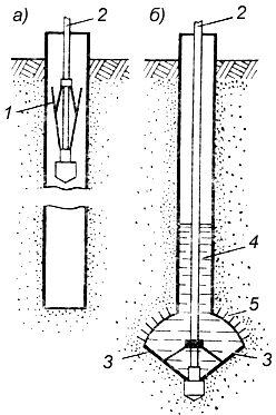 Для устройства уширений применяют также специальные агрегаты, имеющие ствол (штангу) и механизм в виде раскрывающихся ножей. Механизм в сложенном виде опускают на штанге в скважину или оболочку (рис.20, а). Затем ножи постепенно открываются и, вращаясь, образуют в грунте уширение. В несвязных грунтах для укрепления стенок разбуриваемого уширения применяют глинистый раствор (рис.20, б). После окончания разработки уширения ножи складывают, извлекают агрегат, заполняют уширение и ствол сваи (оболочки) бетонной смесью.