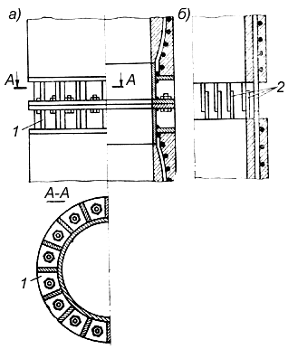 Оболочки погружают с открытым нижним концом. При значительном диаметре их обычно наращивают по мере погружения, и звенья соединяют между собой болтами или сварными стыками. При болтовых стыках каждое звено окаймляют по торцам стальными фланцами, к которым приваривают концы продольной арматуры звена. Фланцы стыкуемых элементов соединяют болтами (рис.18, а). Сварные стыки делают с применением окаймляющих стальных элементов и привариваемых к ним накладок или же со сваркой внахлестку арматурных выпусков (рис.18, б) и последующим бетонированием промежутка между торцами звеньев. Нижнее звено оболочки снабжают стальным кольцевым ножом сварной конструкции.