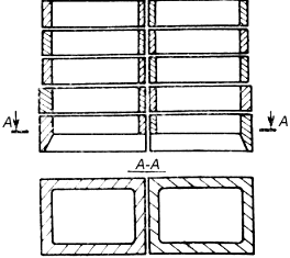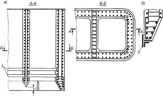 Нижнюю ножевую часть стенок скашивают для облегчения погружения колодца в грунт (рис.24, а). Если в грунте могут встретиться твердые включения, то ножевую часть колодца усиливают металлической окаймляющей конструкцией (рис.24, б). Внутренние поперечные перегородки не доводят до низа колодца примерно на 0,5 м и тоже заостряют внизу для облегчения погружения в грунт (см. рис.24, а). На внутренних поверхностях колодцев, в нижней его части, делают горизонтальные пазы, служащие для лучшей связи с бетоном заполнения.