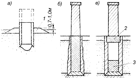 Колодец делают сразу на полную высоту или же постепенно наращивают сверху по мере погружения (рис.21, а). Когда колодец дойдет до проектной глубины, т. е. достигнет надежного грунта, погружение прекращают и заполняют внутреннее его пространство бетонной кладкой, которая вместе с самим колодцем образует массивный фундамент опоры (рис.21, б). Внутреннее пространство колодца не всегда нужно заполнять кладкой, можно ограничиться устройством в нем нижней бетонной подушки, распределяющей давление фундамента на грунт, и железобетонной плиты по верху колодца для поддержания вышележащей части опоры (рис.21, в).
