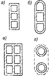 В плане форму колодца желательно делать симметричной для облегчения его опускания. Опускные колодцы фундаментов мостовых опор чаще всего делают прямоугольными в плане с закругленными углами (рис.23, а, б, в). Так как стенкам колодца передаются большие горизонтальные давления воды и грунта, то между ними устраивают вертикальные поперечные перегородки, разделяющие колодец на ячейки. В некоторых случаях применяют круглые в плане колодцы; такие колодцы могут быть опущены по два под каждую опору (рис.23, г). Боковые стенки колодцев при глубине погружения до 8-10 м делают вертикальными, постоянной толщины (см. рис.21, в). При большой глубине погружения наружным поверхностям стенок придают уступы (см. рис.21, б), уменьшающие трение об окружающий грунт и предотвращающие заклинивание колодца при опускании. Силы трения между опускаемым колодцем и грунтом можно сильно уменьшить, подводя к ножу и наружным поверхностям стенок колодца воду или глинистый раствор (тиксотропная рубашка).