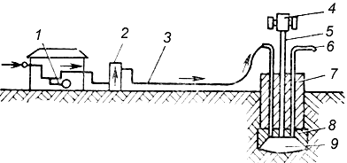 В камере кессона разрабатывают грунт, обеспечивая постепенное погружение кессона. Песчаные грунты с успехом разрабатывают, применяя гидромеханизацию. При твердых грунтах бывает необходимо пользоваться взрывными работами. Для доступа в кессон людей, подъема разрабатываемого грунта и подачи в кессон строительных материалов над его камерой имеется шахтная труба со шлюзовым аппаратом наверху. Шлюзовой аппарат служит для перехода из кессона с повышенным давлением воздуха наружу и обратно. Для этого шлюзовой аппарат имеет камеры, в которых давление может постепенно изменяться. Одну из камер используют для шлюзования людей; в ней давление изменяют достаточно медленно, чтобы не принести вред их здоровью. Грунт и материалы (без присутствия людей) шлюзуют быстро. Воздух в кессон подается компрессорной установкой по воздухопроводу. Для удаления из кессона испорченного воздуха служит сифонная труба (см. рис.25).