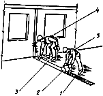 1 - геодезическая риска, 2 - растворная лопата, 3 - растворная постель, 4 - кельма, 5 - рабочий, выполняющий монтажные работы,