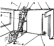 1 - рабочий, выполняющий монтажные работы, 2 - монтируемая панель, 3 - рейка-отвес, 4 - рабочий, выполняющий монтажные работы, старший в звене, 5 - монтажная стойка