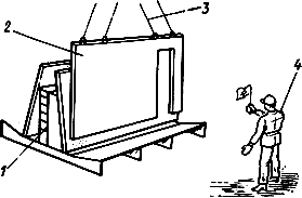 1 - склад-пирамида, 2 -поднимаемый элемент, 3 - стропы траверсы, 4 - рабочий, выполняющий такелажные работы