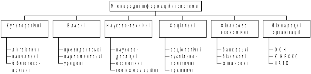 Інформаційні системи (ІС), що використовуються в міжнародній економіці називають міжнародними ІС. Їх класифікують за різними ознаками. Запропоновано наступну ієрархічну класифікацію міжнародних ІС: