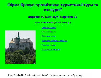 Проілюструємо технологію побудови Web–вітрини, що містить рекламу туристичної фірми “Крокус”. Використовуючи команди мови HTML, створимо код головної Web-сторінки сайту (файл Web_witryna.html), який може бути, наприклад таким: