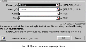 а допомогою команди InsertFunction або шляхом натиснення на кнопку fx на стандартній панелі інструментів викликати стандартну функцію Linest. У діалоговому вікні функції Linest ввести параметри функції, як показано на рис.3.