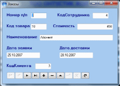 Негізгі беттегі «Тапсырыстар» түймесін басамыз. Бұл формада тауар коды, қызметкер коды, тауар бағасы, тауар аты, тапсырыс берген күні, тапсырыс қабылдаған күні көрсетілген (сурет 8).