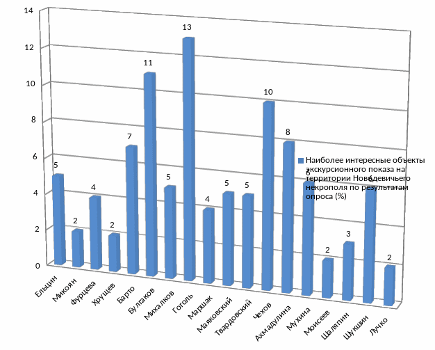 В рамках проведенного исследования автором был разработан маршрут пешеходной экскурсии по Новодевичьему некрополю «Писатели и поэты: жизнь после смерти».