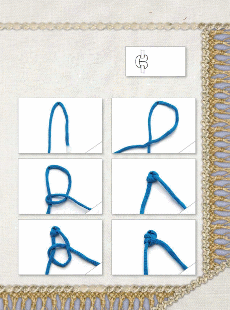 трежьте нить нужной длины, сложите ее пополам и закрепите парными булавками на подушке.Правый конец нити (рабочий) проведите над левым концом (основой), образуя петлю.