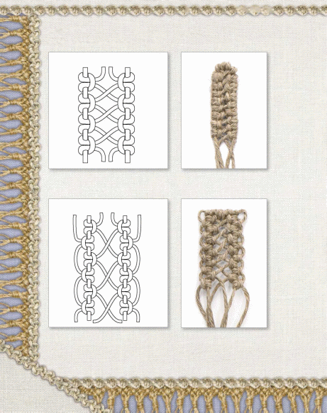 Некоторые узлы используются для оформления работы, а другие применяются в плетении основного рисунка для создания интересной фактуры полотна.