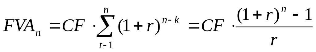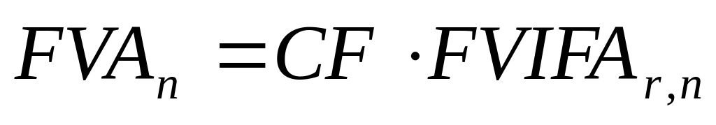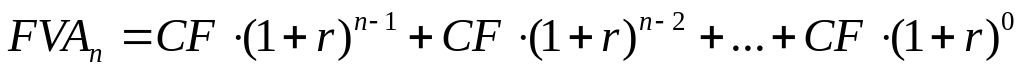 Майбутня вартість звичайного ануїтету (FVA – Future Value Annuities), що триває n періодів, визначається за формулою: