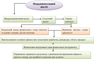 - фундаментальний аналіз – це визначення «справедливої» (внутрішньої) вартості цінних паперів (на основі аналізу діяльності емітента) та порівняння її з ринковою;