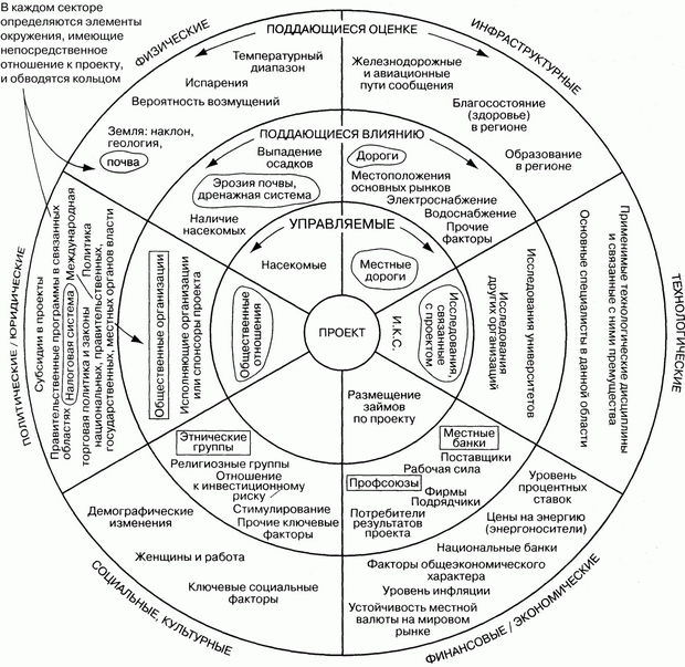 Перечисление всех организационных факторов, характеризующих обстановку вокруг проекта и на рынке. Также необходимо указать благоприятные и неблагоприятные особенности среды, в которой проект будет выполняться (внутри и вне компании), и способность организации-исполнителя к его осуществлению, а организации-заказчика - к использованию его результатов. Далее (см. рис. 1.2) будет показан один из эффективных способов выполнения комплексного анализа окружения и участников проекта. При использовании этого подхода сначала определяется достаточно большое число факторов, действующих в окружении проекта; они заносятся в соответствующий сектор. Затем выделяются наиболее критичные из них (прямоугольники - участники, овалы - факторы окружения) [20]