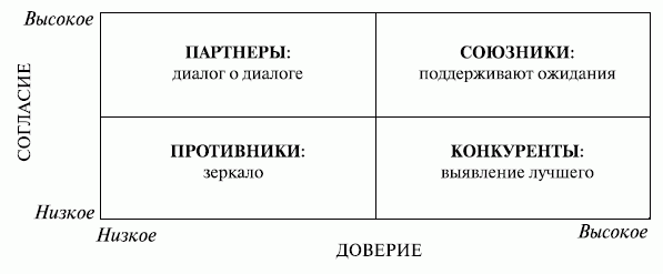 В зависимости от того, в каком из четырех квадрантов образовавшейся матрицы оказывается тот или иной участник (группаучастников), они относятся к нижеуказанным группам, принципы работы с которыми весьма разнятся. Руководителю проекта необходимо установить конструктивный диалог с двумя группами, обладающими высоким уровнем доверия, и сохранять разумную пропорцию их участия.