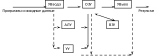 Схема ЭВМ, отвечающая вышеназванным принципам, логично вытекает из последовательного характера преобразований, выполняемых человеком по некоторому алгоритму (программе). Обобщенная структурная схема ЭВМ первых поколений представлена на рисунке 1.