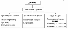 Исходя из данных рисунка 2, можно увидеть структуру управления фирмы. Директор организации составляет график работы персонала, руководит работой менеджеров, решает все внештатные ситуации, контролирует правильное выполнение всеми сотрудниками своих должностных обязанностей. Заместитель директора имеет все те же вышеперечисленные функции, которые он выполняет при отсутствии директора на рабочем месте. Бухгалтерская служба занимается финансово-расчетной деятельностью, а также предоставлением отчетов главному директору. Работники склада выполняют приемку, расфасовку и отгрузку товара. Отдел продаж собственно занимается реализацией товара.