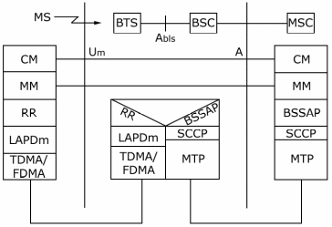 Передача сигналов между MSC и подсистемой базовых станций осуществляется через систему ОКС№7 (уровни МТР, SCCP и прикладную подсистему базовых станций BSSAP, Base Station Subsystem Application Part). Подсистему BSSAP можно разделить на две подсистемы: прикладную подсистему управления базовыми станциями (BSSMAP) и прикладную подсистему прямой передачи (DTAP).