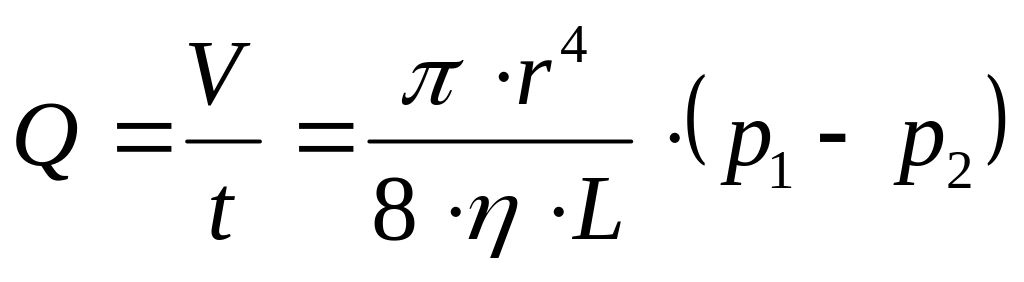 Рассмотрим часто встречающийся случай ламинарного движения жидкости по трубке с круглым сечением под действием разности давлений на её концах. Впервые этот случай был исследован французским врачом и физиологом Пуазейлем при изучении движения крови по сосудам; в дальнейшем она получила широкое применение в физике и технике. Формула Пуазейля позволяет рассчитать объёмную скорость течения жидкости по известным значениям радиуса трубки г, её длины L, вязкости жидкости и разности давлений на концах трубки p1 – р2 (рис. 6).