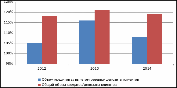 Рисунок 6. - Отношение общего объема кредитов к депозитам и отношение объема кредитов за вычетом резерва к депозитам ( %).