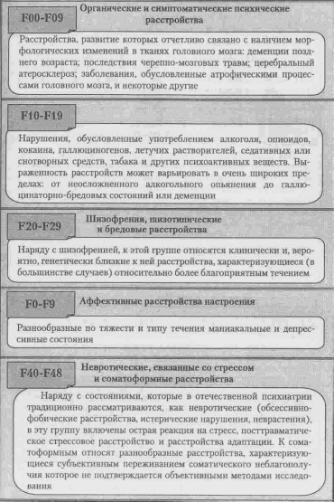 Официальной классификацией психических расстройств в нашей стране считается Международная классификация болезней 10-го пересмотра (МКБ-10), но наиболее распространенной и широко используемой в практической деятельности врачей является, пожалуй, систематика, разработанная во Всероссийском Центре психического здоровья, которая приведена на стр. 78. Она представляет собой пример этиопатогенетической классификации в психиатрии, то есть разграничение отдельных нозологических форм (заболеваний) осуществляется в зависимости от причин их возникновения и механизмов развития. Классифицирующими признаками, при этом, являются: