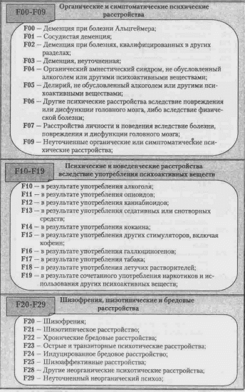Приведенная на стр. 79 Международная классификация болезней 10-го пересмотра (МКБ-10) базируется на совершенно иных методологических принципах. В её основе лежит сознательный отказ от попытки группировки психических расстройств в зависимости от этиопато-генетических механизмов их развития (что, практически, означает отказ от нозологического принципа в психиатрии). В рамках каждого из перечисленных на стр. 79-80 диагностических разделов МКБ-10 приводится подробный перечень психопатологических состояний (диагностических рубрик), относящихся к данной группе расстройств (приведены на стр. 81-83) с указанием основных критериев их диагностики. Это делает классификацию очень удобной для практического использования. В то же время, следует отметить описательный характер МКБ-10: разграничение заболеваний осуществляется исключительно по их клиническим проявлениям, чем определяется её некоторая громоздкость и что, особенно на начальных этапах, затрудняет её применение. Кроме того, описательный характер этой классификации не всегда способствует целенаправленному выбору этиопатогенетической терапии. Например, диагноз «депрессивный эпизод» будет выставлен (при наличии определенного набора признаков) больному вне зависимости от того, какие факторы (психогенные, экзогенные, генетические и пр.) имели основное значение в его формировании. Будучи ориентированной на феноменологическую (описательную) диагностику психических расстройств, МКБ-10 способствует, таким образом,