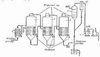Установка состоит из нескольких (в данном случае трех) корпусов. Исходный раствор, обычно предварительно нагретый до температуры кипения, поступает в первый корпус, обогреваемый свежим (первичным) паром. Вторичный пар из этого корпуса направляется в качестве греющего во второй корпус, где вследствие пониженного давления раствор кипит при более низкой температуре, чем в первом.